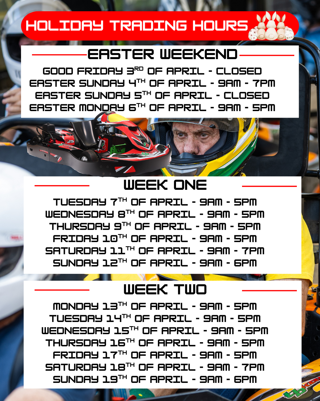 Experience is recommended. Drivers need confidence to manage the heavy steering and raw power of the 18HP go-kart.